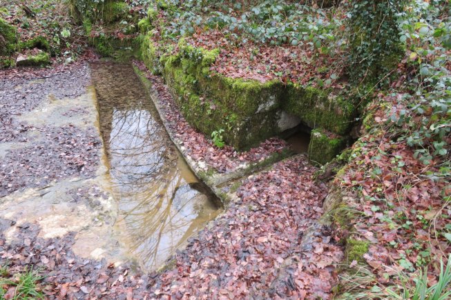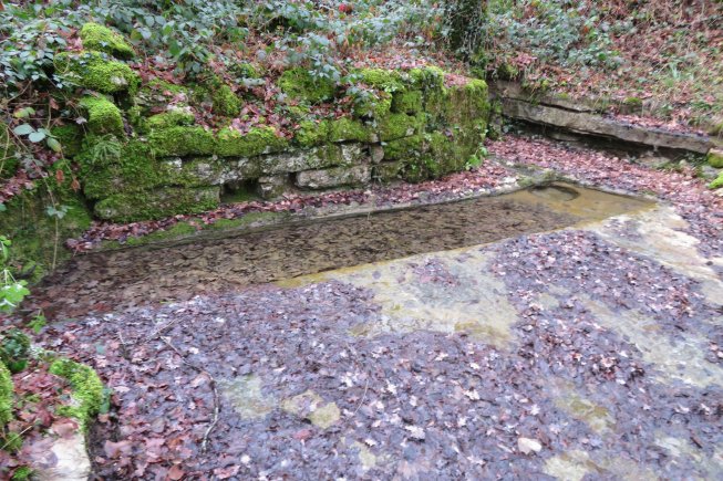 Nous voici à la fontaine des grands prés. Bernard nous explique qu’elle alimentait une ancienne ferme situé au-dessus. Nous voyons que la dalle calcaire a été creusée pour y loger une seille. Qui dit « ce sont des affamés qui ont crevé la dalle « ? Les randonneurs ne manquent pas d’humour !